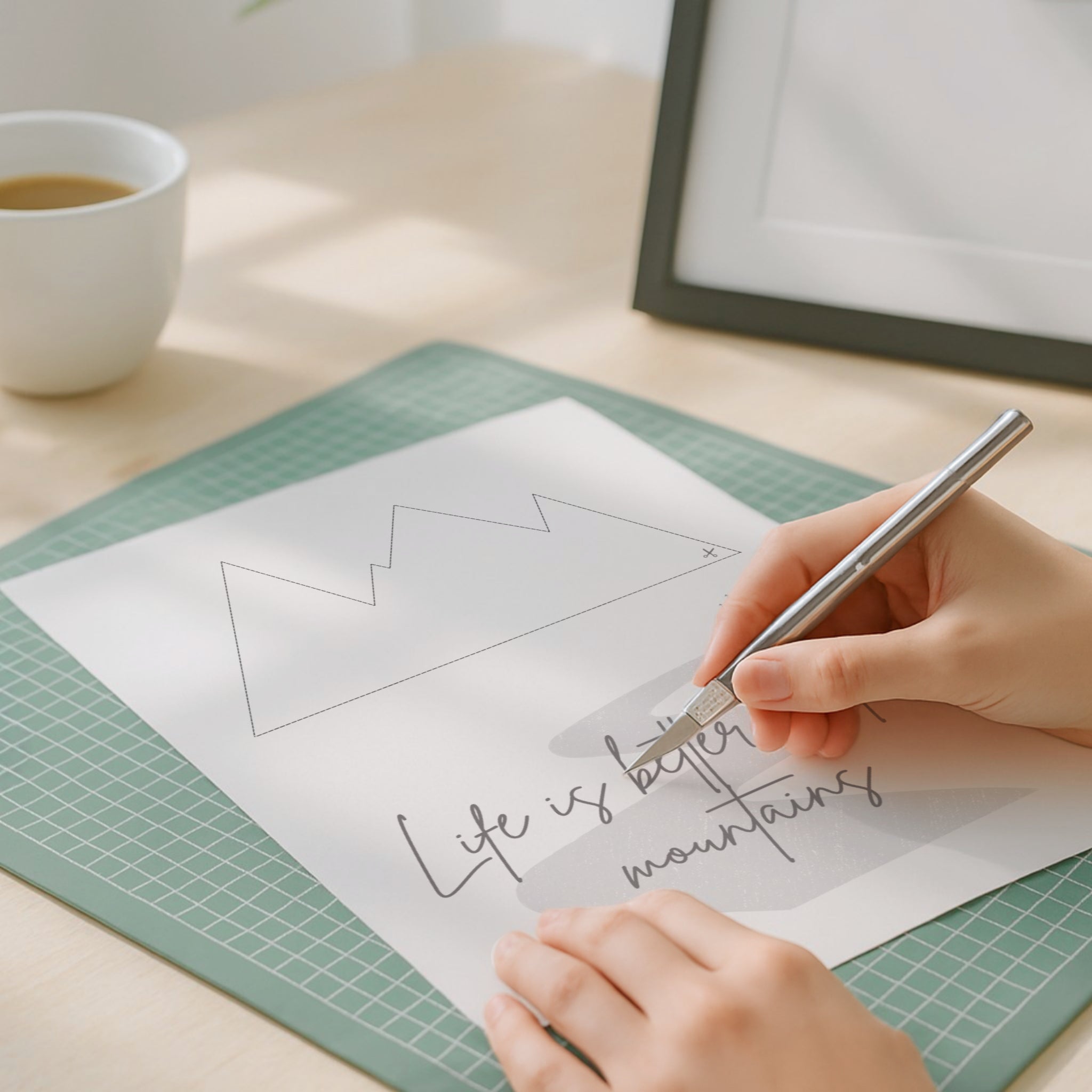 Schneide das Motiv mit einer kleinen Schere oder einem Bastelmesser entlang der gestrichelten Linie aus. Die geraden Kanten der Bergsilhouette machen das Ausschneiden besonders einfach.