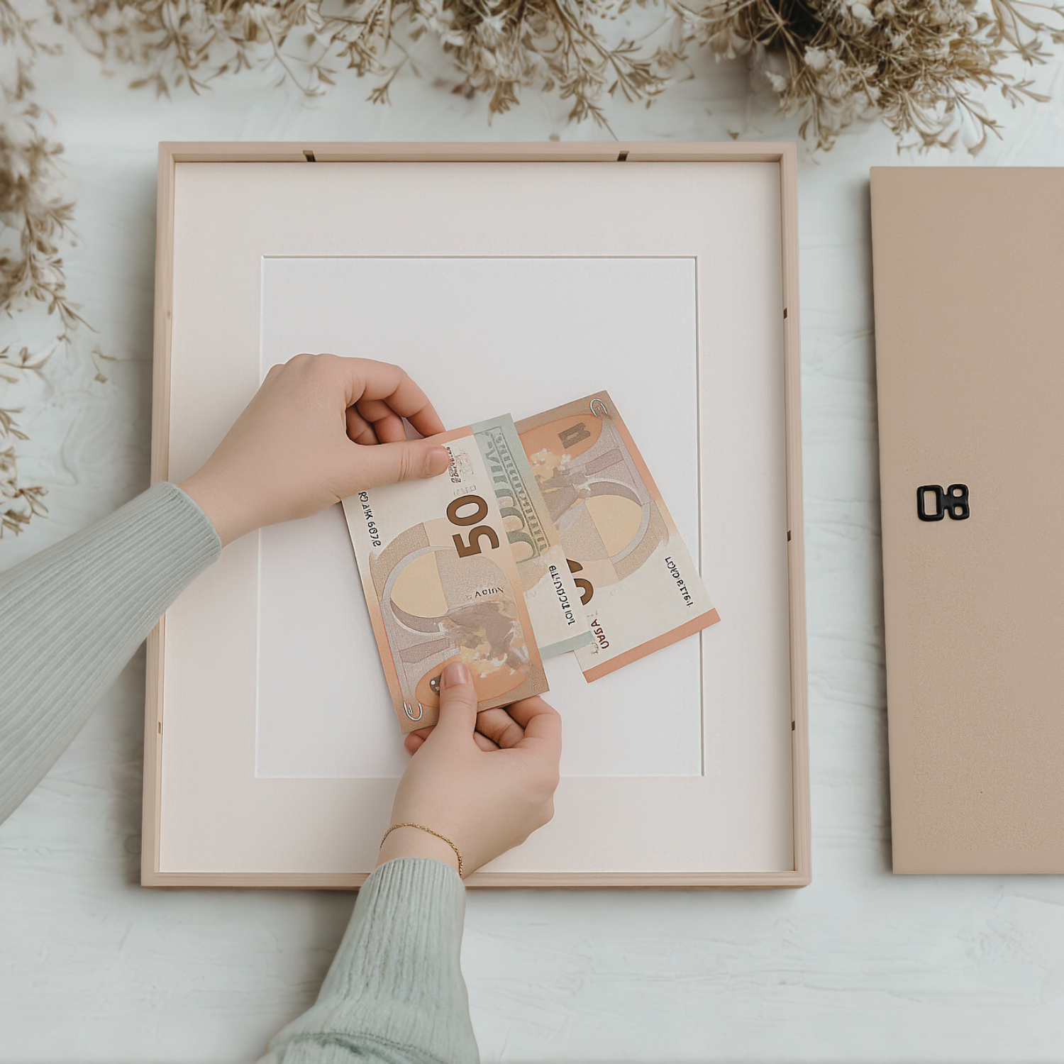 Lege die gewünschten Geldscheine hinter die ausgeschnittene Fläche und fixiere sie gegebenenfalls mit einem kleinen Stück Klebeband auf der Rückseite, damit alles stabil sitzt.